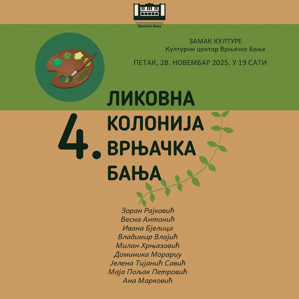 Отварање изложбе „4. Ликовна колонија Врњачка Бања“ биће уприличено у Замку културе, у петак 28. новембра 2025. године, са почетком у 19 часова.